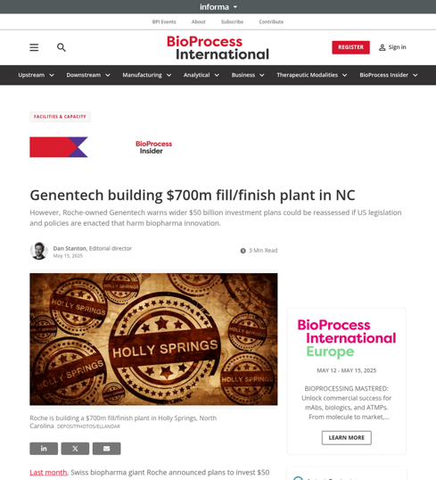 Violet PR collaborated with EDPNC, the North Carolina Governor’s Office, and company representatives to announce Genentech’s decision to invest $700 million in a new manufacturing plant in Holly Springs, tied to the 2025 SelectUSA Investment Summit. We developed a tailored media pitch and press release aimed at ensuring North Carolina was not only mentioned prominently in the coverage but also featured in 15+ headlines—a result that is far from guaranteed in private-sector announcements, where the state’s role often gets overshadowed.