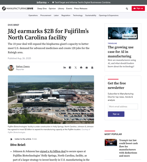 Shortly after, Violet PR news jacked the announcement of Johnson & Johnson’s $2 billion investment in North Carolina to expand its U.S. manufacturing footprint, leveraging the timing to reinforce the state’s position as a hub for life sciences and biomanufacturing.